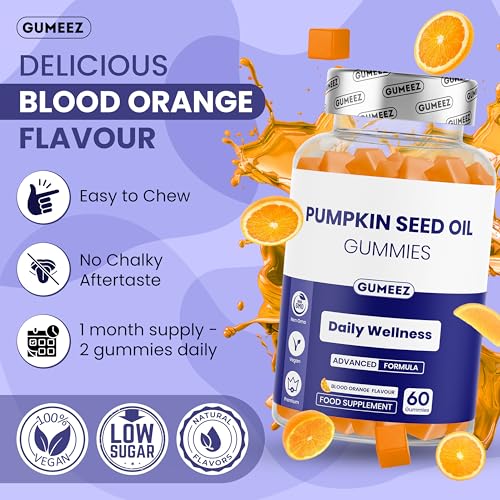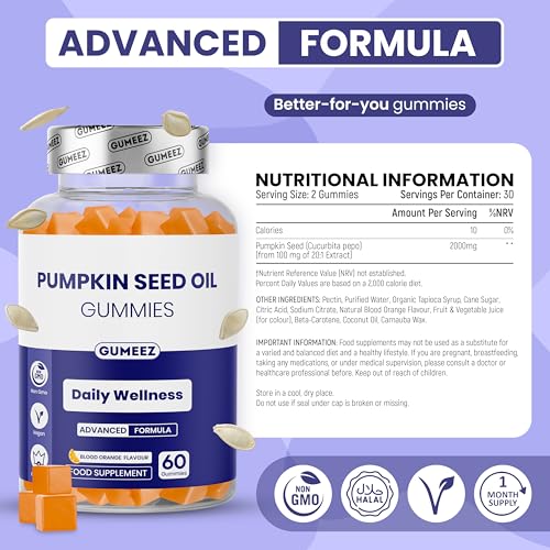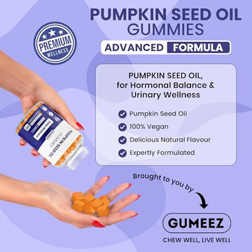 𝗛𝗜𝗚𝗛 𝗦𝗧𝗥𝗘𝗡𝗚𝗧𝗛 𝗣𝗨𝗠𝗣𝗞𝗜𝗡 𝗦𝗘𝗘𝗗 𝗢𝗜𝗟 𝗚𝗨𝗠𝗠𝗜𝗘𝗦: Each serving provides 2,000 mg pumpkin seed oil (from 100 mg of 20:1 extract) in an easy-to-take gummy format - delivering the concentrated goodness of this traditional botanical.𝗘𝗡𝗛𝗔𝗡𝗖𝗘 𝗬𝗢𝗨𝗥 𝗗𝗔𝗜𝗟𝗬 𝗪𝗘𝗟𝗟𝗡𝗘𝗦𝗦: Pumpkin Seed Oil has been traditionally used to support urinary comfort, hormonal balance and overall wellness in both men and women - ideal for active, health-conscious lifestyles.𝗕𝗟𝗔𝗗𝗗𝗘𝗥 & 𝗣𝗥𝗢𝗦𝗧𝗔𝗧𝗘 𝗦𝗨𝗣𝗣𝗢𝗥𝗧: Formulated with high-strength Pumpkin Seed Oil, traditionally used to support bladder comfort and urinary health. A natural source of essential fatty acids and phytosterols that contribute to normal prostate function in men and urinary balance in both men and women.𝗛𝗔𝗜𝗥, 𝗦𝗞𝗜𝗡 & 𝗛𝗢𝗥𝗠𝗢𝗡𝗔𝗟 𝗦𝗨𝗣𝗣𝗢𝗥𝗧: Pumpkin Seed Oil is rich in zinc, antioxidants, and omega fatty acids - nutrients known to promote thicker-looking hair, nourish skin, and support normal hormonal activity. Ideal for men and women seeking natural daily balance and beauty from within.𝗗𝗘𝗟𝗜𝗖𝗜𝗢𝗨𝗦 𝗕𝗟𝗢𝗢𝗗 𝗢𝗥𝗔𝗡𝗚𝗘 𝗙𝗟𝗔𝗩𝗢𝗨𝗥: Made with natural Orange flavouring. No earthy taste, chalky tablets or large Pumpkin Seed Oil capsules – just great-tasting vegan gummies you’ll actually look forward to.𝗠𝗔𝗗𝗘 𝗜𝗡 𝗖𝗘𝗥𝗧𝗜𝗙𝗜𝗘𝗗 𝗙𝗔𝗖𝗜𝗟𝗜𝗧𝗜𝗘𝗦: Manufactured in an ISO, GMP & HACCP certified facility. 100% vegan, non-GMO, and made without artificial colors or preservatives.𝗦𝗨𝗕𝗦𝗖𝗥𝗜𝗕𝗘 & 𝗦𝗔𝗩𝗘 𝟭𝟬%: Enjoy up to 10% off our premium Pumpkin Seed Oil gummies with automatic deliveries, so you never run out of your favourite GUMEEZ products!